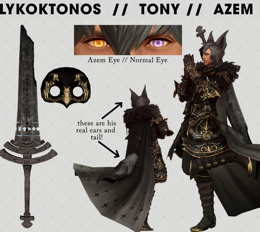 Long story short, Lykoktonos was taken in by Venat after she came across him in her travels. They developed a sibling relationship, with Venat shared with him her love of Etheirys and traveling. When she retired, he took her place at the Seat of Azem.On one of his own travels, Tony was instructed to deal with a creation that had developed a soul, a wolf-like being named Skoll. The two fought, and when they were both on the edge of death, they made a pact. This saved their lives, but in turn Tony became akin to a hemitheos, along with losing his ability to speak & developing more wolf-like features.Upon returning to Amaurot, he & Skoll were considered abominations and were subsequently blamed for the Final Days.